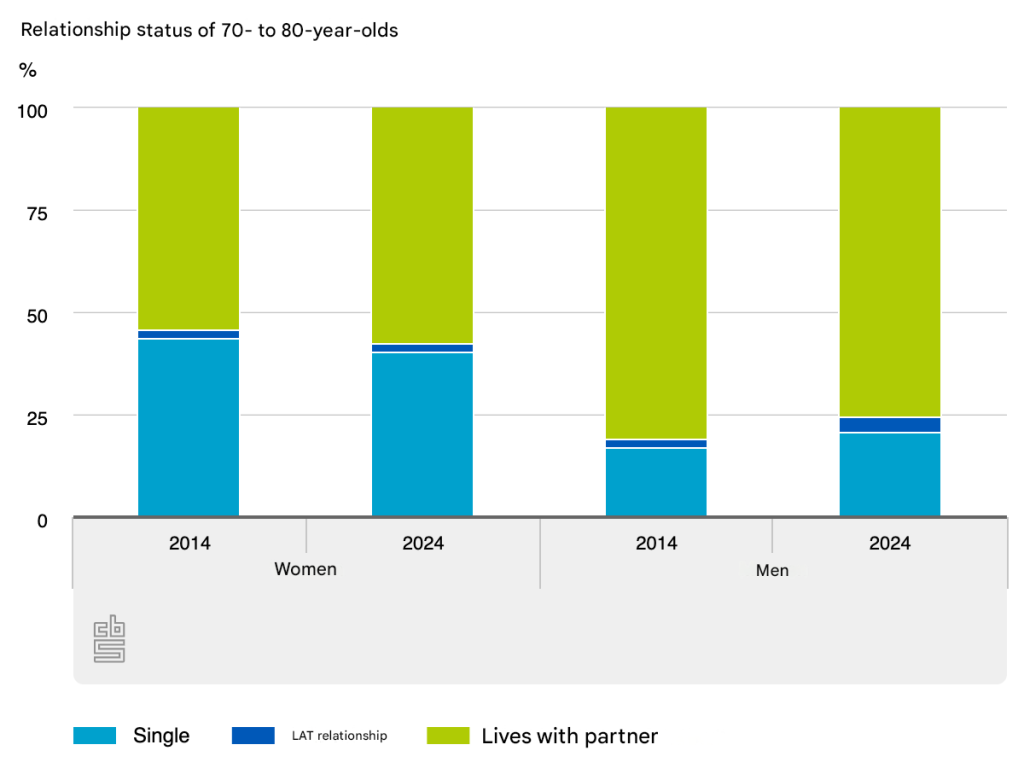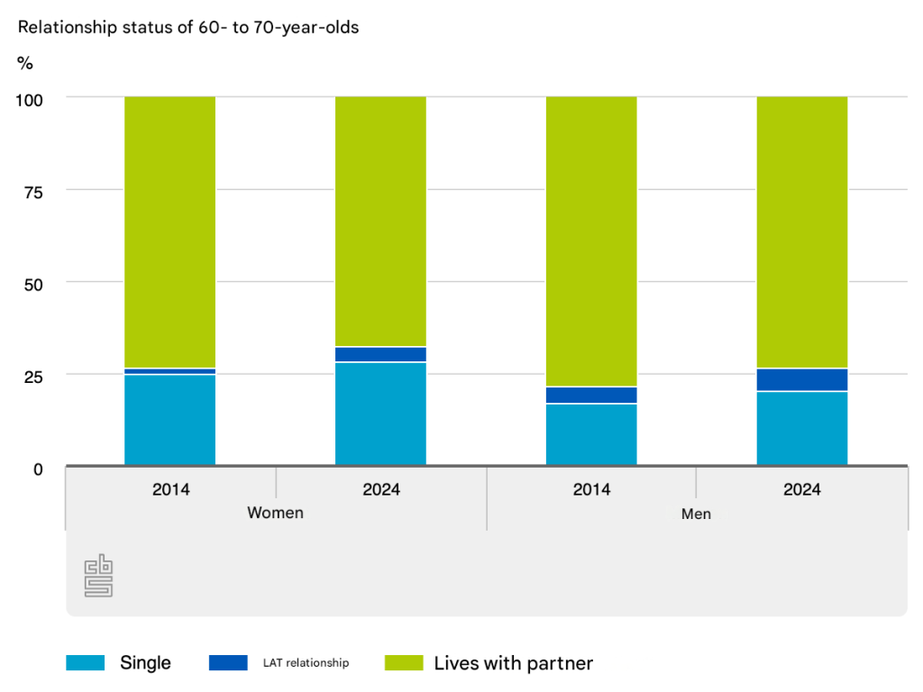 The data also highlights changes from 2014 to 2024 and differences between age groups. Approximately 5% of people aged 60 to 70 are now in LAT relationships, compared to 3% in 2014. At the same time, the number of seniors in this age group who live together with their partner has dropped from 76% in 2014 to 70% in 2024. Men in this group are more likely than women to live with a partner, and slightly more men choose to be in a LAT relationship compared to women.